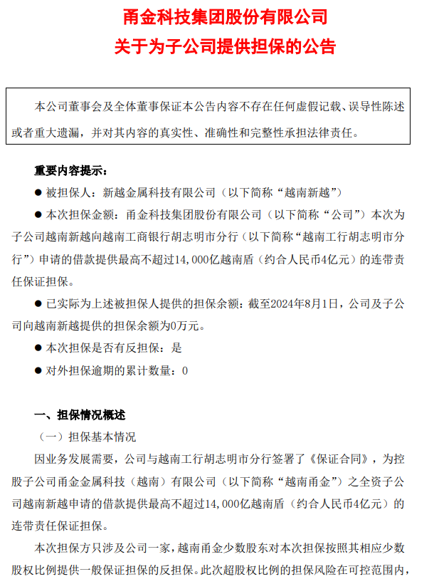 8月3日,據(jù)《甬金科技集團(tuán)股份有限公司關(guān)于為子公司提供擔(dān)保的公告》稱,“因業(yè)務(wù)發(fā)展需要,公司與越南工行胡志明市分行簽署了《保證合同》,為控股子公司甬金金屬科技(越南)有限公司(以下簡(jiǎn)稱“越南甬金”)之全資子公司越南新越申請(qǐng)的借款提供最高不超過14,000億越南盾(約合人民幣4億元)的連帶責(zé)任保證擔(dān)保。”(來源:甬金科技集團(tuán)股份有限公司關(guān)于為子公司提供擔(dān)保的公告)