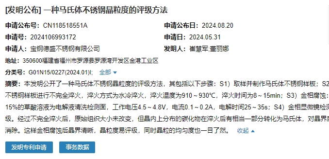 2024年8月20日,寶鋼德盛不銹鋼有限公司成功申請一項(xiàng)名為“一種馬氏體不銹鋼晶粒度的評級方法”專利,申請公布號為CN118518551A,申請日期為2024年5月31日。