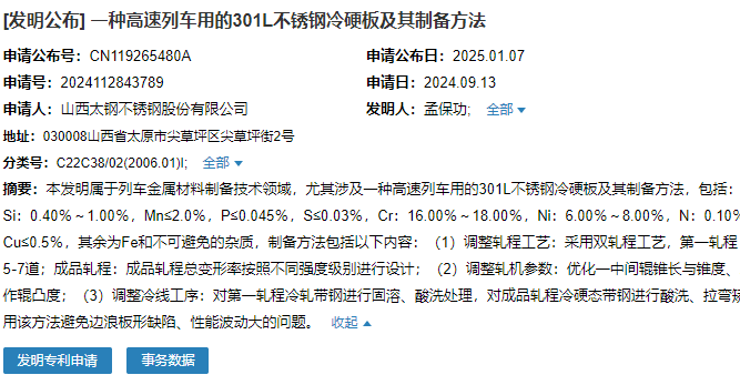 2025年1月7日,山西太鋼不銹鋼股份有限公司成功申請一項名為“一種高速列車用的301L不銹鋼冷硬板及其制備方法”專利,申請公布號為CN119265480A,申請日期為2024年9月13日。